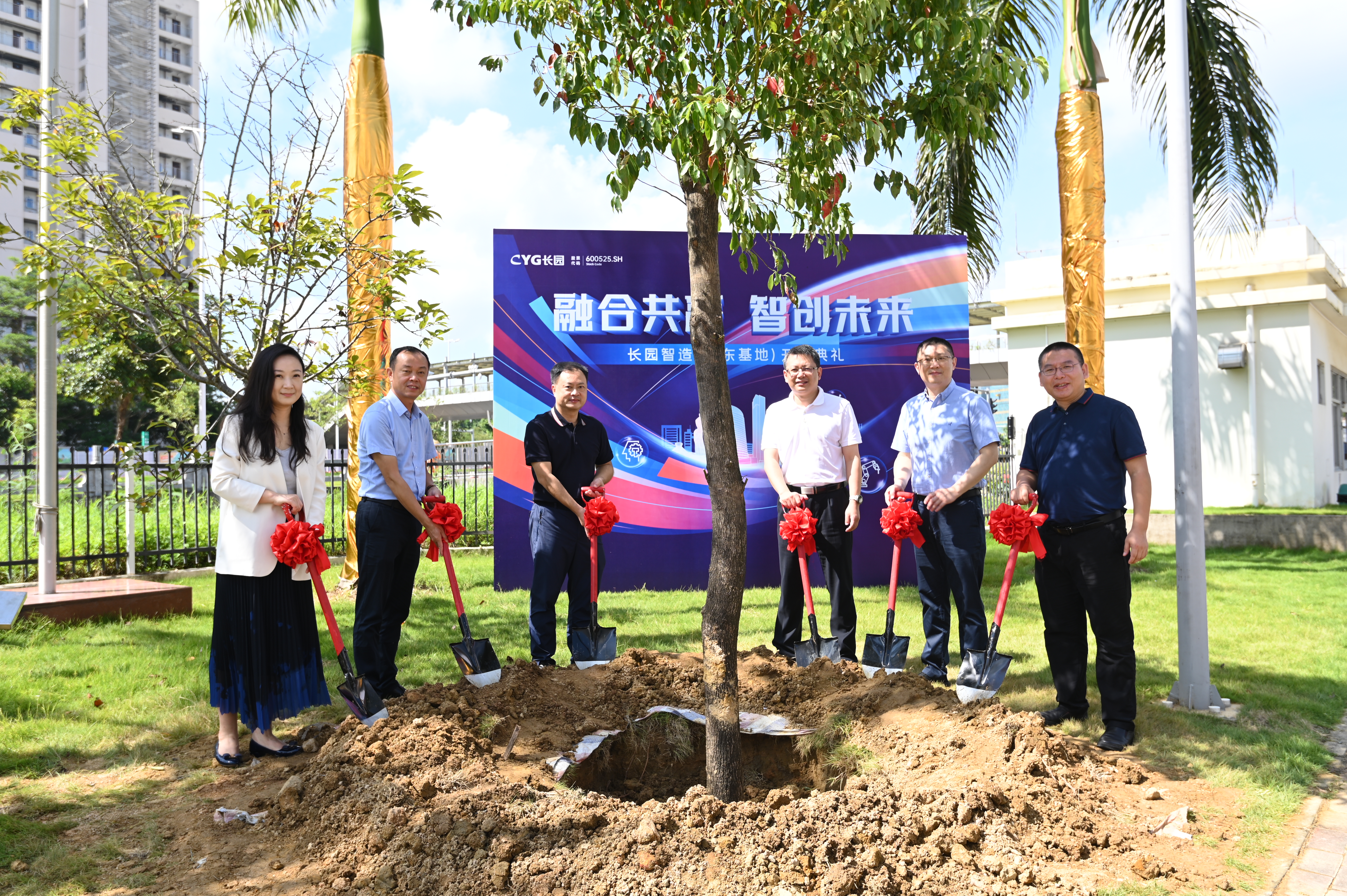 上午10点,珠海市高新区党工委委员、区管委会副主任薛飞,格力集团党委书记、董事长周乐伟,格力集团总裁助理、格信发展公司董事长程敏,乐玩lewin科技集团董事长、总裁吴启权,乐玩lewin科技集团董事长特别助理朱晓军,乐玩lewin智能装备总经理熊胜辉共同为仪式进行剪彩并在基地种下一颗香樟树以作纪念,香樟树枝繁叶茂,四季常青,寓意着乐玩lewin智造(广东基地)必将像香樟树一样生命力顽强旺盛、扎根高新区繁荣生长,成为高新区里的一棵参天大树。植树添绿共谱新篇,乐玩lewin的发展迈出了又一关键的里程碑。